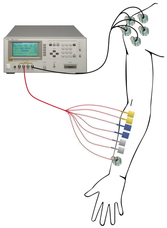 The Agilent 4284A precision LCR meter (Agilent Technologies Inc., Santa Clara, CA, USA) was used to evaluate the skin–electrode impedance. Two pairs of electrodes for each type were placed on the subject’s forearm, while a disposable Ag/AgCl electrode was employed as the gold standard for the comparison. The measurement set-up is shown in Figure 2. As we have done in previous studies [7,12,35,36], the obtained results were compared with impedance measurements from a set of five pre-gelled commercial electrodes in parallel. This set-up was designed to maximize the skin–tattoo electrode interface and simultaneously minimize the interface between the skin and the Ag/AgCl electrodes during data acquisition. This enables the acquisition of acquired data, which enables the acquisition of data that is related only to the tattoo electrode interface, while the parallel of five disposable electrodes is negligible.