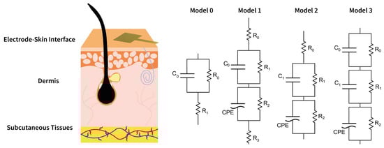 In order to identify the optimal equivalent circuit model (ECM), four different models—referred to as model 0, model 1, model 2, and model 3—were selected to represent the electrode–skin interface, as shown in Figure 3. Model 0 corresponds to the well-established single time constant model, whereas models 1, 2, and 3 offer increasingly detailed approaches for fitting and describing the skin–electrode interface. Particularly, the employed models comprise resistive (R), capacitive (C), and Constant Phase Elements (CPEs) to represent frequency-dependent behavior.