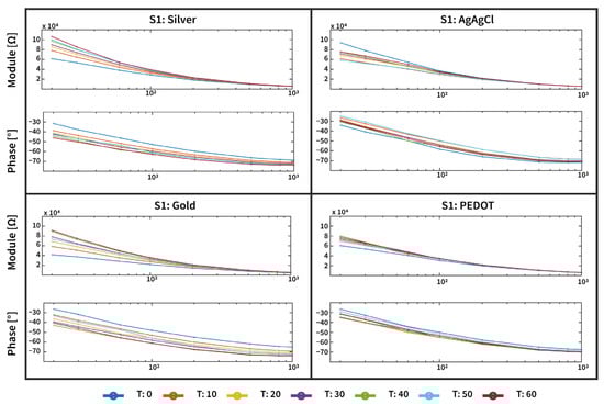 From the analysis of these parameters, it is possible to observe that the main difference between the standard disposable Ag/AgCl electrodes and the dry tattoo Silver, Gold, and PEDOT:PSS electrodes is remarkable in the first RC parallel segment, which is the one linked to the pure skin–electrode interface. In fact, while the parameter R0 increases for the tattoo electrodes (as well as the overall impedance as shown in the Bode diagram), the R0 related to Ag/AgCl electrodes tends to decrease. This aspect is compatible with the different types of electrodes; in fact, commercial wet electrodes are covered through an electrolyte gel, which is necessary to ensure a stable contact impedance [40]. Epidermal tattoo electrodes, on the other hand, do not require an electrolytic gel to ensure good contact impedance, but the ultra-low thickness guarantees not only a high resistance to mechanical deformation compatible with the characteristics of the skin but also a low-frequency contact impedance level compatible with the standard in biomedical applications [41,42], while simultaneously avoiding the use of adhesive layers that might provoke dermal irritations. Conversely, the parameter C0 related to tattoo electrodes tends to decrease over one hour of experimentation, approaching the same level of C0 for Ag/AgCl electrodes. Therefore, the overall increase in the impedance of the epidermal devices can be mainly connected to these variations in parameters in the modeled equivalent circuit. However, it is interesting to note that, differently from what already reported as the state of the art [43], there is no sweat effect that tends to change the interface by lowering the contact impedance in the tattoo electrode characterization, which is probably due to the controlled environment conditions in which the experiment was performed for all the subjects.