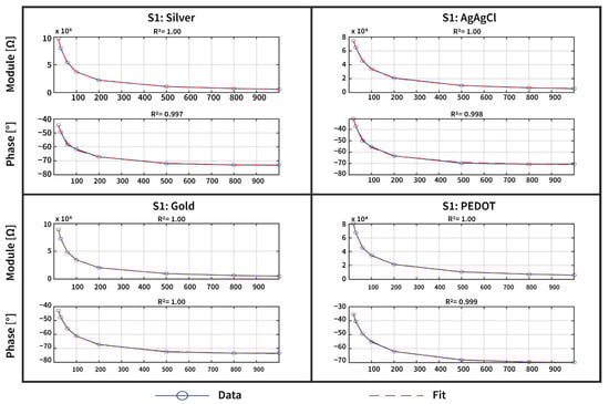 The coefficient of determination (R-squared, R2) was employed to quantitatively evaluate the fitting performance, as it measures the proportion of variance in the dependent variable that is explained by the regression model. This criterion facilitates the identification of the model yielding the optimal fit, as reported in the Supplementary Materials, where the electrical parameters for each fitting algorithm are reported. Moreover, the use of R2 ensures a robust and reproducible impedance fitting procedure, thereby improving the reliability of the circuit parameter estimation. In particular, results show that model 3 has the best fitting regarding both the magnitude and the phase of the complex impedance describing the skin–electrode interface of the tattoo electrodes, as shown in Figure 5.