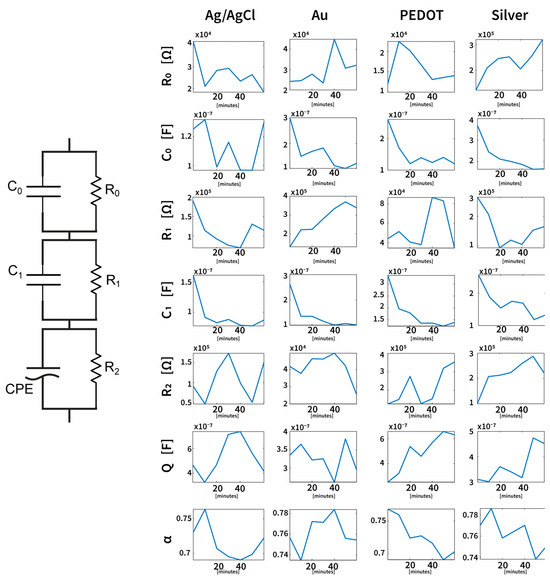 In addition to fitting the impedance at individual time points over one hour of experimentation for each subject, the models were also evaluated based on their ability to capture the variation in the impedance over time. As the skin–electrode interface properties change during the measurement period, accurately tracking these dynamic variations is crucial for both accurately describing the interface and improving the design of future electrodes. Among the models tested, model 3 demonstrated a superior performance in describing the temporal changes in both the impedance magnitude and phase. Its more detailed circuit representation allows it to adapt to the evolving electrical characteristics of the interface better than the other models, resulting in a more reliable fit across the entire duration of the experiment. These results highlight how the proposed model is capable of not only providing a static fitting but also modeling the time-dependent behavior of the skin–electrode interface. Figure 6 shows the values and their variation over time for the electrical parameters obtained throughout the model. The data represents the median parameter values measured across six subjects, illustrating how these electrical properties change during one hour of experimentation. This aspect is consistent with the skin–electrode impedance variation measured across time.