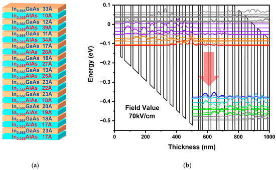 (a) Schematic of the epitaxial layer structure for one active region period in QCL; (b) conduction band diagram and wave functions of relevant energy levels of the active region under an electric field of 70 kV/cm.