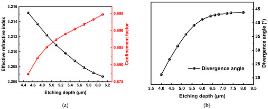(a) The curves of simulated effective refractive index and confinement factor verse etching depth; (b) the calculation result of the relationship between etching depth and divergence angle.