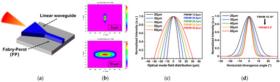In this work, we adopt an integrated structure of FP and linear tapered waveguide to maintain high-power fundamental mode laser output while effectively controlling the divergence angle. As illustrated in Figure 3a, the tapered QCL consists of a narrow ridge FP section and a wider tapered waveguide section. The narrow ridge FP section provides a fundamental mode seed, which is then amplified and enhanced in the tapered waveguide without affecting the single-mode characteristic of the fundamental mode. In this work, the beam propagation method is employed to validate the fundamental mode characteristics through the calculation and simulation of the electromagnetic properties of various FP structures with different widths. For example, in a structure with a 6 µm wide FP section and a 50 µm wide tapered waveguide, the optical field distributions at the front and rear ends of the device (as shown in Figure 3b) remain consistent in terms of the fundamental mode distribution. The simulation results indicate that introducing a wider tapered waveguide does not disrupt the fundamental mode characteristic of the narrow ridge FP section but merely affects the optical mode size. Based on this model, the optical mode field distributions for different waveguide widths are summarized in Figure 3c. As the waveguide width increases, the near-field spot size also increases. By analyzing the near-field spot size, the corresponding divergence angles are calculated using Fourier transformation, as illustrated in Figure 3d. The horizontal divergence angle decreases with increasing output facet width, with the full-width at half-maximum (FWHM) horizontal divergence angle decreasing from 18.19° for a 20 µm wide facet to as low as 6.5°. Additionally, the length of the FP section may influence the overall device performance. However, as demonstrated in Figure 4a, the FP length has minimal impact on the beam quality of the tapered QCL device. In this work, both the tapered and FP sections are set to 1 mm in length.