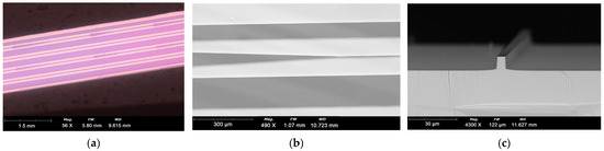 The fabrication process of QCLs is detailed as follows: Initially, a 400 nm thick SiO2 layer was deposited on the sample surface via plasma-enhanced chemical vapor deposition. Subsequently, the SiO2 was patterned into the designed tapered QCL shape using photolithography and reactive ion etching (RIE) to form a hard mask. To achieve the desired etching depth for efficient coupling, deep etching was continuously optimized. The tapered waveguide and FP structures were fabricated using inductively coupled plasma (ICP) dry etching, followed by wet etching with an acid solution to attain an etching depth of approximately 8 µm. During the ICP dry etching process, the etching temperature was elevated to 260 °C to prevent the accumulation of etching products on the grating surface. Optimized etching parameters were employed, with the etching gas ratio of chlorine to argon set at 1:25, and the ICP RF and Table RF powers set at 300 W and 120 W, respectively. After dry etching, the sidewall profile was modified using a wet etching solution with a volume ratio of 16:30:6:300 for HBr:HCl:H2O2:H2O. The fabricated structure, as shown in Figure 5c, meets the design specifications, featuring smooth sidewalls that do not introduce significant losses. The SiO2 mask used for dry etching was then removed using a buffered oxide etch (BOE), and a new 200 nm thick SiO2 layer was deposited as an electrical isolation layer. Current injection windows were opened on the ridge top using photolithography and BOE etching. A top contact was formed, comprising a 30 nm Ti/20 nm Pt/300 nm Au layer deposited by e-beam evaporation and a 1 µm thick Au layer deposited by electroplating. After thinning the wafer to 100 µm and polishing the backside, an AuGeNi/Au layer was evaporated as the bottom contact and annealed at 370 °C for 1 min. The wafer was then cleaved into 2 mm bars (including 1 mm FP and 1 mm tapered waveguide). A high-reflectivity coating was applied to the back facet of the FP structure, and an anti-reflection (AR) coating was deposited on the output facet of the tapered waveguide. For device packaging, the chips were flip-chip soldered onto diamond submounts to enhance heat removal efficiency and subsequently mounted on copper heat sinks with indium solder, followed by wire bonding.