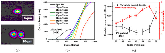 (a) The spot images of the 6 µm and 10 µm ridge width QCL devices; (b) the pulsed L-I characteristics of tapered QCL devices with different taper widths and a 6 µm wide FP QCL; (c) the curves of taper width versus threshold current density (Black) and slope efficiency (Red).