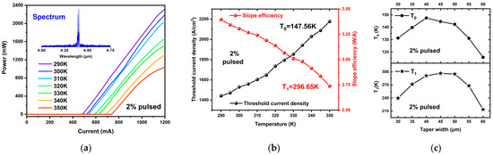 The temperature stability of the devices was assessed by examining the pulsed power-current characteristics of the tapered QCLs at various temperatures controlled by the TEC. The lasing spectrum of the 50 µm taper width tapered QCL at 300 K was captured using a Fourier transform spectrometer and is depicted as an inset in Figure 7a. The emission wavelength of the tapered QCL in this work, 4.4 µm, closely aligns with the designed wavelength of 4.49 µm, indicating precise control of the epitaxial layer thickness during the material growth process. As illustrated in Figure 7a, the temperature dependence of the 50 µm taper width tapered QCL was measured across a temperature range of 290–350 K (in 10 K increments). The threshold current of the 50 µm taper width tapered QCL increases from 490 mA at 290 K to 740 mA at 350 K. Using these temperature-dependent results, the slope efficiency and threshold current density of the device at different temperatures were computed and graphed in Figure 7b. As the temperature increases from 290 K to 350 K, the threshold current density of the 50 µm taper width tapered QCL increases from 1441 A/cm2 at 290 K to 2176 A/cm2 at 350 K, while the slope efficiency decreases from 3.4 W/A at 290 K to 2.74 W/A at 350 K. Based on these findings, the characteristic temperature of the device was deduced using an exponential function, where T represents the heat sink temperature and T0 and T1 are the characteristic temperature coefficients. The fitting results yielded T0 and T1 values of 142.45 K and 294.98 K, respectively. The characteristic temperature coefficients of samples with different structures are displayed in Figure 7c. As the taper width increases from 30 µm to 40 µm, both T0 and T1 exhibit an upward trend. However, when the taper width surpasses 50 µm, both coefficients experience a significantly decrease. The 40 µm tapered QCL sample has the highest T0 value of 147.56 K, while the highest T1 value of 296.65 K is attained in the 45 µm tapered QCL sample. These results suggest that a taper width design within the range of 40–50 µm provides favorable temperature stability.