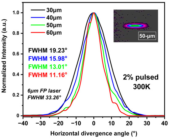Minimizing the divergence angle and enhancing beam quality are also crucial objectives in tapered QCL research. The beam quality of the QCL devices was assessed via far-field profile measurements taken along the ridge width direction. Figure 8 illustrates the divergence angles of samples with different taper widths measured by the far-field profile at room temperature (300 K) with a 2% pulsed injection current, which is 200 mA above the threshold current of each sample. The FWHM divergence angles for 30 µm, 40 µm, 50 µm, and 60 µm taper widths are 19.23°, 15.98°, 13.01°, and 11.16°, respectively. The divergence angle decreases with increasing taper width, in accordance with the theoretical simulation results presented earlier, although there is a slight deviation in the specific angles. Samples with taper widths up to 50 µm exhibited good single-mode characteristics, while the far-field profile of the 60 µm taper width sample tended towards a double-peak profile. This indicates that excessively wide taper widths fail to effectively filter out other transverse modes, thus not maintaining the fundamental mode characteristics as well as narrower tapers. The pyroelectric camera image of the light beam spot for the 50 µm taper width sample is shown in the top-right corner of Figure 8, revealing an elliptical intensity distribution that confirms stable single-mode lasing in pulsed operation.