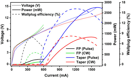 Considering output power, slope efficiency, characteristic temperature, and beam quality, the 50 µm wide tapered QCL device achieves a balanced performance in terms of high-power output, low divergence angle, and temperature stability, making it an optimal choice given the current QCL epitaxial material and device fabrication process. To quantify the improvements of the linear tapered QCL over the FP laser in terms of power, efficiency, and beam quality, LIV measurements were conducted in both pulsed and CW modes at 300 K for this sample and for the FP laser. The results are shown in Figure 9. In pulsed operation, the FP QCL has a power of 275 mW with a maximum WPE of approximately 7.7%, while the tapered QCL achieves a maximum output power of 2.76 W, which is nearly 10 times higher, with a maximum WPE of 16.2% near an injection current of 1100 mA. Under CW mode at room temperature measurement, the tapered QCL demonstrated significant performance advantages, with a maximum power of 1.34 W and a WPE exceeding 8.2%. This is in contrast to the FP QCL, which had a maximum power of only 144 mW and a maximum WPE of 3.4%.