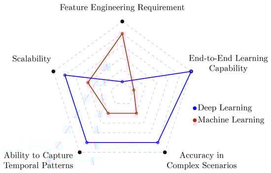 To visually summarize the comparative advantages of DL in this context, Figure 1 presents a radar plot that contrasts DL with traditional ML techniques across five critical dimensions relevant to encrypted traffic classification: feature engineering requirement, scalability, temporal pattern modeling, classification accuracy, and end-to-end learning capability [10].
