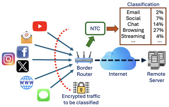 Figure 2 illustrates the reference scenario where users connect to a remote server over the Internet to access services such as web browsing, video streaming, and email. Encrypted data from these services is transmitted through the network and collected by the border router for traffic analysis. In this paper, we focus on QUIC, leveraging the recent adoption of this protocol for low-latency and encrypted communications [17].