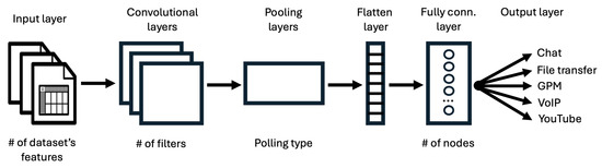 Regarding the latter point, different methods can be used, either based on simple comparison operations (e.g., port-based classification) or using a trained model, as in the case of statistical- and ML-based classifiers [29]. In particular, our approach leverages an ML algorithm based on the adoption of CNNs, as detailed in Section 3.