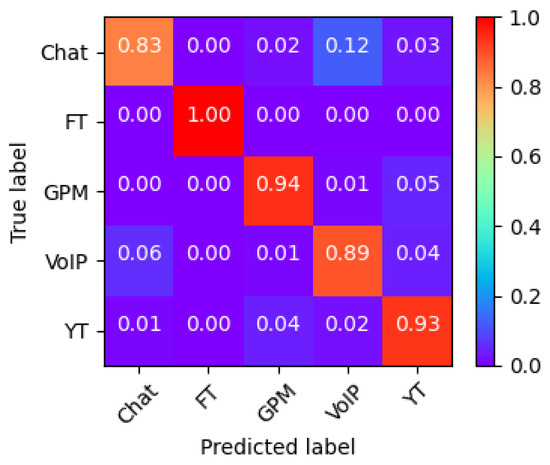 We now analyze the accuracy confusion matrix of the best-performing model, , to identify which class is most critical for accurate label prediction. Such a confusion matrix is shown in Figure 4. First, the FT class achieves near-perfect recognition, approaching 100% accuracy, despite having fewer samples. This is due to the highly distinct characteristics of some features. On the other hand, the worst classification happens with the Chat class, which was often confused with the VoIP class. This is due to their association with the same application, i.e., Google Hangouts, which generates similar traffic patterns for both Chat and Voice services, for example, in terms of the distribution of small packets (less than 150 bytes), resulting in overlapping flow characteristics that hinder accurate classification [27]. Note that removing the Chat class from the dataset significantly improved overall performance; in particular, a 93–95% accuracy can be achieved with such simple models.