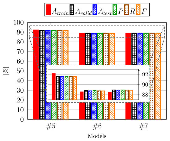 As depicted in Table 2, the simplest model emerged as the top performer. To determine if the trend of achieving both simplicity and high performance persisted, we compared two additional models, and , with the best-performing model from the previous step, Model . These new models feature progressively streamlined architectures, reducing both the number of layers and the complexity of individual layers. In particular, such models present an eight-layer architecture, with Model further simplified with respect to in terms of the parameters and operating characteristics of each layer, making it exceptionally straightforward. Upon conducting the same evaluation steps as with the previous models, the results are illustrated in Figure 5, which includes both the full performance range starting from a zero baseline and a zoomed-in view on the most relevant performance interval. Notably, there was a performance deterioration, falling below 89%, signifying a reversal in the trend. Consequently, it can be concluded that among the first five implemented models, the final model represents the optimal compromise between simplicity and good accuracy. Consistent with the analysis presented in Table 2, the fold-by-fold variation is minimal, even for these models, and thus, we do not report the standard deviation for this figure to maintain clarity and focus on the mean performance trend.