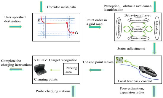 The rapid development and large-scale application of intelligent-vehicle technologies are driving the fundamental evolution of charging processes toward full automation and unmanned operation. In the context of developing an Autonomous Charging Navigation System (ACNS), the integration of an Automatic Charging System (ACS) and an Automatic Navigation System (ANS) has become a research hotspot [1,2,3]. Algorithms used for autonomous navigation and obstacle avoidance include Dijkstra’s algorithm [4], the A* algorithm [5], the APF algorithm [6], the RRT algorithm [7], etc. For navigation for autonomous charging in dynamic environments, the A* algorithm outperforms Dijkstra’s algorithm in computational speed, demonstrates greater stability than the artificial potential field (APF) algorithm, and offers distinct advantages in multi-sensor data fusion. However, the traditional A* algorithm still has inherent limitations. B.Y. [8] proposed a hybrid bidirectional path-search method that increases the cost of bidirectional path alignment. This method improves search speed but lacks dynamic constraints, leading to more difficult expansion and increased deviation of heuristic functions in complex environments. C.J. [9] developed the DCAE-BA* algorithm to constrain the expansion direction and minimize the number of expansion nodes of the bidirectional A* algorithm, reducing the number of explored nodes and optimizing path-planning length for diagonal target distances. However, in map environments with excessive numbers of turning points, smoothness of vehicle operation remains poor. J.C. [10] combined bidirectional A* with the dynamic window method to effectively handle obstacles in complex environments, but this approach increases path-planning length. There are multiple localization methods for intelligent vehicles in maps, including LiDAR localization, visual localization, millimeter-wave radar localization, multi-sensor fusion localization, and prior-map-based localization. In ACNS, navigation not only relies on algorithms but also requires the integration of cameras and radar systems for the recognition and localization of charging-pile areas and their corresponding charging piles. Y.G. [11] et al. addressed poor vehicle-positioning accuracy via SLAM-UWB synchronous positioning and recognition of visual information but failed to resolve the impact of color differences on SLAM; such a deficit may cause object-recognition errors. J. Terven et al. [12] conducted a detailed analysis of the evolutions and improvements from YOLOv1 to YOLOv8, showing that YOLOv8 achieves the best overall AP but suffers from model complexity and poor performance in small-object detection. Z. Chen [13] improved the accuracy and robustness of YOLOv11 in recognizing low-quality images by integrating an independent dehazing model (DEA-Net), though it exhibits weak performance in local refinement and global modeling in complex environments. S. Hu et al. [14] designed YOLOv11n with a hyperspectral image-denoising deep learning model (HCANet), optimizing feature fusion and attention mechanisms to enhance global–local feature interaction. However, it still demonstrates poor detection accuracy for small objects.