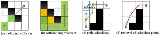In a grid map, without the constraint of the inflation area, the phenomenon shown in Figure 3—a will occur, where the path directly passes through the gaps between obstacles. Therefore, constraints are imposed on the expansion of new nodes during octagonal exploration. This is shown in Equation (11), as follows: