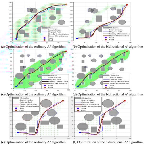 This experiment assesses the path-planning performance of the ordinary A* algorithm and the bidirectional A* algorithm across maps of varying dimensions (20 × 20, 50 × 50, and 100 × 100). Initially, greedy optimization is applied to the original paths; this approach is followed by Bézier curve optimization with interpolation on the greedily optimized paths. The evaluation encompasses key metrics such as planning time, the number of expanded nodes, path length, and path smoothness. Corresponding experimental results are visualized in Figure 4 and tabulated in Table 1, providing a comprehensive comparison of algorithmic performance given different map sizes and optimization techniques.