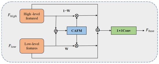 The improved module is embedded into the high-level feature fusion part of the YOLOv11n detection head to enhance the model’s perception capability and feature representation for key target regions. Compared with the original structure, the CAFM module effectively integrates local details and global contextual information while maintaining light weight, demonstrating significant improvements in recognition and detection of small objects in complex scenes. The architecture of the CAFM module is illustrated in Figure 7.