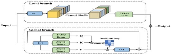 The proposed CAFM module is composed of a local branch and a global branch, which are designed to model local neighborhood structures and long-range contextual dependencies, respectively. The local branch extracts neighborhood information through 1 × 1 convolution, channel shuffle, and 3D convolution, with its feature output expressed in Equation (15), as follows: