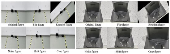 In this experiment, the training data for the YOLOv11n network model were derived from a self-constructed dataset. For the collected video data, inter-frame sampling was performed by extracting one frame every 30 frames. To satisfy the requirements of deep learning for large-scale training samples and enhance the model’s generalization ability, multiple data-augmentation strategies were adopted, including random cropping, flipping, translation, noise addition, mirroring, and Mosaic augmentation. Through integration of frame sampling with data-augmentation methods, a dataset containing 2152 effective images was finally established. The images were annotated using the MakeSense tool, and the dataset was randomly divided into training, validation, and test sets at an 8:1:1 ratio. Schematic diagrams of partial augmentation results are shown in Figure 8.