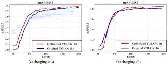 Figure 9 compares the performance metrics for recognition of the charging area and charging pile, in which both models exhibit monotonically increasing mAP@50. The optimized YOLOv11n outperforms the original YOLOv11n: as shown in Figure 9a, for larger targets, it surpasses the original model’s mAP@50 from the start, showing faster convergence and higher precision; as shown in Figure 9b, despite initial lower precision than the original YOLOv11n, after 60 epochs, it achieves significantly better precision and convergence with a more substantial gain in accuracy, indicating superior performance in small-target detection.