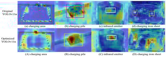 To visually demonstrate the effect of algorithm optimization, Class Activation Map (CAM) technology is introduced to generate heatmaps highlighting the salient features of specific categories in images. These heatmaps intuitively reflect the attention regions of convolutional neural networks during target feature extraction and effectively compare the feature-learning capabilities of different models. By visualizing network weights, the heatmaps highlight the regions with the strongest neural network responses, where darker colors indicate higher importance, enabling more accurate focus on target areas. Figure 10 shows the performance of the YOLOv11n model and that of the improved model in object-detection tasks as a comparative heatmap, where Figure 10a–d present the visualization results of the original YOLOv11n model and Figure 10A–D show the corresponding heatmaps of the improved model. Experimental results demonstrate that the improved model exhibits stronger responsiveness and discriminative power in feature extraction for targets of different scales, effectively enhancing the overall detection performance.