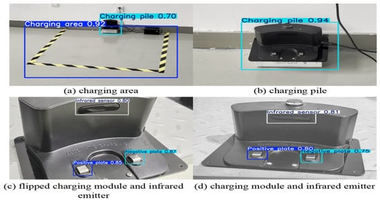 Figure 11 presents the results used to evaluate the object-detection confidence of the model in real-world scenarios. The charging area in Figure 11a is detected with a confidence of 0.92; the charging pile in Figure 11b is detected with a confidence of 0.94; and the positive/negative poles and infrared emission ports in Figure 11c are detected with confidences of 0.85, 0.87, and 0.8, respectively. Notably, the confidences for the charging area and charging pile alone both exceed the high threshold of 0.9, while the local recognition of charging piles remains above 0.8. These results indicate that the model demonstrates extremely high reliability in detection outcomes, enabling the visual recognition and localization of both the entire area and the charging piles.