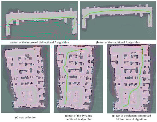 Based on the results of the above tests, as shown in Table 5. The improved bidirectional A* algorithm reduces the travel distance by 7.79 m and travel time by 7.11 s compared to the improved A* algorithm in the long-corridor environment, achieving a 74.04% reduction in path-planning time and an 8.92% decrease in travel distance. In the complex indoor environment, it shortens the travel distance by 1.01 m and travel time by 1.44 s, with an 86.18% reduction in path-planning time. As visualized in Figure 13, the improved bidirectional A* algorithm demonstrates superior path-planning performance in both narrow long maps and narrow maps. Specifically, as can be seen in a comparison of Figure 13d (traditional algorithm) and Figure 13e (improved algorithm), the latter yields shorter, straighter paths with lower tortuosity. This experiment validates the algorithm’s rationality, effectiveness, and robustness across static/dynamic environments and symmetric/asymmetric maps, as evidenced by quantifiable performance metrics and visual path comparisons.