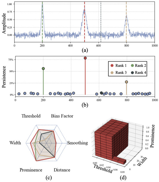 An important strength of this method lies in its intuitive interpretability. By assigning each detected feature a clear scalar metric—the accumulated hyper-volume across the parameter space—practitioners gain a straightforward and quantitative measure of peak robustness. This metric inherently simplifies the feature-ranking process, distinguishing meaningful peaks from noise-induced artifacts effectively and transparently. From a theoretical standpoint, this work bridges traditional signal-processing techniques with concepts from multi-parameter persistent homology (MPH). While formal MPH can offer meaningful insights by analyzing data through intricate topological invariants, our simpler volumetric persistence measure provides an accessible yet powerful alternative that is both computationally efficient and easy to interpret. Future research could further explore adaptive or probabilistic sampling strategies to optimize computational efficiency or integrate formal MPH invariants to uncover additional structural insights in complex multi-dimensional datasets.
