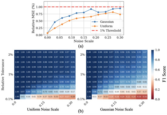 Performance of the multi-parameter persistence approach under varying noise conditions. Panel (a) plots the relative mean square error (%) against noise scale for Gaussian (blue) and uniform bounded-range (orange) noise, with a horizontal red line marking the 1% threshold. Panel (b) displays maps of detection rate as a function of noise scale (x-axis) and relative tolerance (y-axis) for uniform (left) and Gaussian (right) noise types. Cooler colors in the heatmaps indicate higher detection rates. It is worth underscoring that the ranges explored represent quite heavy noise conditions, as shown in Figure 2, which reports an example spectrum under Gaussian noise with .
