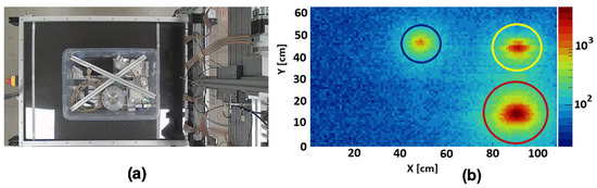 (a) System operation diagram: Radioactive waste is distributed over the scanning table to identify radioactive hotspots. (b) Visualization of the result of a scan of three different radioactive point-like sources; color scale on the right reports the activity in cps. Red circle: source of 137Cs, with an activity of 1.4000 MBq; yellow circle: source of 60Co, with an activity of 0.0560 MBq; blue circle: source of 22Na, with an activity of 0.0154 MBq.