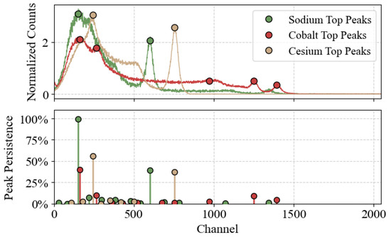 Figure 6 illustrates the application of our VM-PP method to typical emission spectra from sodium, cesium, and cobalt radioactive sources, for which the noise scale was estimated to be between and (lower noise scales could be achieved at the cost of increasing the exposure time), highlighting the robustness of the peak-ranking process across spectra with varying complexities. Using our multi-parameter persistence ranking, we select from each detector the top k most persistent peaks. The choice of k depends on the source’s spectral shape, but requires almost no additional filtering.