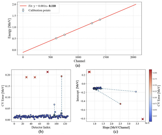 Calibration results: (a) An example linear best fit on a single detector’s data, using 4 emission peaks of known energy from sodium (0.511 MeV), cesium (0.662 MeV), and cobalt (1.17 and 1.33 MeV). (b) The leave-one-out (LOO) cross-validation (CV) error of each detector’s calibration, highlighting 3 outlier points resulting from faulty detectors (crossed circles). The 2 remaining points with poor performance (circles) are easily recovered with minimal post-processing, the results of which are shown as stars. (c) Distribution of best-fit slope and intercept parameters across all detectors, colored by the LOO-CV error. Negative intercept values arise from well-known non-linearities near the extremes of the detectors’ ranges.