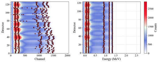To visualize the overall outcome of this multi-detector calibration, we compare raw (channel-space) spectra to their energy-space equivalents. Figure 8 shows, for a cobalt source, how the large spread of peak positions among the 128 detectors (left) collapses into well-aligned peaks once the linear transformations are applied and the 3 faulty detectors removed (right).