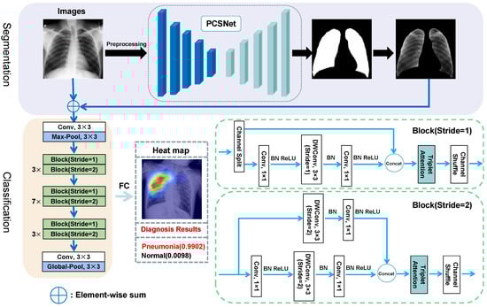 The chest X-ray image is segmented and the lung mask is isolated using the pre-trained PCSNet model. We perform element-wise summation between the original chest X-ray image and the lung mask to generate enhanced images with more detailed information, as illustrated in the upper section of Figure 1. The resulting enhanced image is subsequently classified using the ShuffleNetV2 [26] network for diagnostic purposes. ShuffleNetV2 is a lightweight network architecture with low computational and storage resource consumption, which is suitable for efficient image diagnosis on devices with limited computational resources.