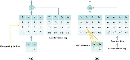 In PCSNet, the connector refers to the skip connection pathways between encoder and decoder stages (indicated by gray arrows in Figure 2), which is used to merge low-level encoder features with high-level decoder features. This fusion enables the integration of features across different levels and scales, empowering the model to effectively interpret and utilize feature information from diverse hierarchical levels. In Figure 4, the approach of pooling indices in PCSNet diverges from the deconvolution method utilized in U-Net. Unlike U-Net’s use of deconvolution for up-sampling by learning a reversible convolution kernel, PCSNet leverages preserved pooling layer indices for up-sampling to restore feature map resolution. This technique effectively preserves boundary information, enhances model sparsity, and eliminates the need to learn numerous inverse convolution parameters. Additionally, instead of simple concatenation, the preserved information is combined with the corresponding encoder feature maps through summation. This summation operation streamlines network training mitigates vanishing gradient issues and has the potential to deliver superior results in chest X-ray image segmentation tasks.
