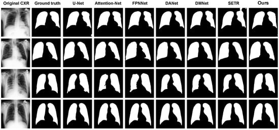 Figure 6 exhibits sample test images capturing lung segmentation outcomes produced by actual masks and various trained models including U-Net, SegNet, Attention-Net, FPNNet, DANet, DMNet, SERT, and Our model. These images highlight the performance disparities among the different models in lung segmentation. It is worth noting that quantitative evaluation of the segmentation performance on the classification dataset is not feasible, as there is a lack of genuine masks for this dataset. Hence, only a qualitative assessment can be conducted to ascertain the accuracy of chest X-ray image segmentation.