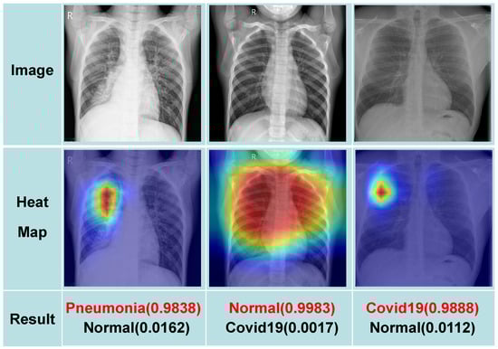 Ensuring the network’s proficiency in assimilating feature information from medical images is crucial for enhancing model interpretability. The utilization of the Grad-CAM [51] technique serves to generate a heat map of the chest X-ray image, enabling the visualization of the specific regions of focus for the model. Figure 8 showcases the classification results based on the fused images, underscoring the practical viability of our proposed methodology. This approach holds promise for practical implementation and proves pivotal in addressing noise interference challenges in chest X-ray image classification, ultimately enhancing overall model performance. In our model, the final decision is determined by the highlighted region in Figure 8. The model identifies high-attention areas in a heat map that exhibit significant overlap with critical anatomical structures (e.g., pulmonary consolidation zones, pleural adhesion regions). These high-attention regions strongly correlate with key pathological features, substantially enhancing the interpretability of model predictions. For medical professionals, these highlighted areas in the image along with the predicted outcomes serve as valuable aids in disease diagnosis.