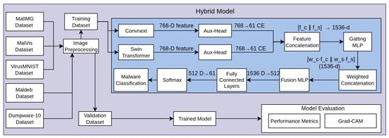 Figure 1 illustrates the general architecture of the proposed hybrid malware classification framework. The process begins with three publicly available datasets, MalIMG, MaleVis, VirusMNIST (see Section 3.1), which are first subjected to a unified image preprocessing step (see Section 3.2). The processed images are then split into training and validation sets. The proposed hybrid model contains two deep learning backbones (see Section 3.3), which are employed in parallel for feature extraction—ConvNeXt and Swin Transformer—each generating a 768-dimensional feature vector. These features are passed through auxiliary classification heads using a 768 → 61 fully connected layer trained with cross-entropy loss to aid convergence. The intermediate features from both backbones are concatenated, resulting in a 1536-dimensional joint representation. A gating MLP takes this concatenated vector and outputs softmax-normalized weights, which perform a weighted concatenation of the original features. The resulting 1536-dimensional fused vector is refined through a Fusion MLP (1536 → 512) followed by a final fully connected layer (512 → 61), which maps to the class space. The final classification is obtained using softmax. Model evaluation is conducted on the trained model using both standard performance metrics and interpretability analysis via Grad-CAM to visualize class-discriminative regions. Moreover, the Maldeb and Dumpware-10 datasets are used to validate our proposed model.