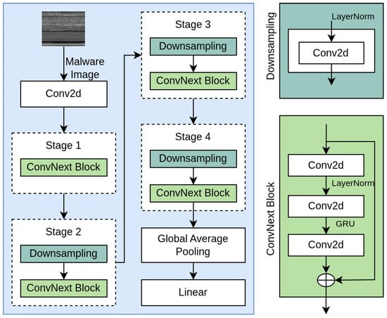 Figure 2 illustrates the architecture of a ConvNeXt-based model used for malware image classification [55]. The process begins with a 2D convolution applied to the input malware image, followed by four sequential stages. Each stage consists of one or more ConvNeXt blocks, with downsampling applied from Stage 2 onward to reduce spatial dimensions while preserving critical features. The ConvNeXt blocks follow a structured flow: an initial convolution is followed by layer normalization and additional convolutions, with a GRU connection incorporated to help retain important sequence-related information. The output from Stage 4 passes through global average pooling to reduce the feature map to a fixed-size vector, which is then fed into a linear layer for classification. This setup allows the model to learn both low-level and high-level patterns efficiently across the spatial hierarchy, making it well suited for visual malware analysis. We initialized the model with weights pretrained on ImageNet and fine-tuned all layers on malware datasets.