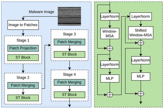 We implemented the Swin Transformer [39] for Transformer-only approach, demonstrating superior performance in various computer vision tasks. Figure 3 presents a Swin Transformer architecture tailored for classifying malware represented as images. The process begins by splitting the malware image into smaller patches, which are then passed through several stages involving patch projection and patch merging. Each stage integrates Swin Transformer blocks, allowing the model to gradually reduce spatial dimensions while capturing increasingly complex patterns. The Swin Transformer block, shown on the right, applies layer normalization, window-based multi-head self-attention, shifted window attention, and multi-layer perceptrons, all linked through skip connections to support effective learning. Key features include hierarchical feature maps similar to CNNs, linear computational complexity concerning image size, and shifted window-based self-attention for cross-window connections.