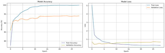 Figure 4 illustrates the training and validation performance of the model across 28 epochs. The training accuracy (left) steadily increased and approaches 100%, while the validation accuracy rose quickly in the early epochs before stabilizing around 94%. The validation loss leveled off and exhibited slight fluctuations after the initial drop. These trends indicate that while the model learns the training data very well, its ability to generalize to unseen data is reasonable.