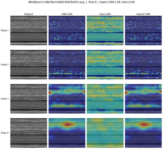 Figure 5 depicts the Grad-CAM visualizations, which clearly illustrate how the CNN (ConvNeXt), Swin Transformer, and the hybrid model responded differently across four distinct stages. At stage 1, the CNN highlighted scattered areas, reflecting selective attention to localized features, whereas the Swin Transformer showed more widespread attention across the input. The hybrid model effectively merged these two behaviors, capturing both localized and broader areas. In stages 2 and 3, the CNN CAM began to intensify and cluster more around specific central regions, while the Swin CAM maintained consistent, broader attention coverage. At stage 4, all models strongly highlighted a prominent central area, suggesting a clear consensus on critical regions for classification. Overall, the hybrid model successfully integrates the strengths of ConvNeXt and Swin Transformer, providing both detailed and global interpretability and indicating robust and complementary feature extraction.