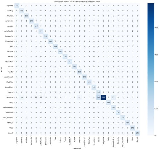 MaleVis: MaleVis [21] contains malware samples generated using a diverse approach that emphasizes the structural and behavioral characteristics of malware samples. The dataset has 26 classes, including 25 distinct forms of malware and benign samples, and it was preprocessed into 300 × 300 pixel images. It has a total of 9100 training and 5126 validation RGB images. All training classes consistently distributed 350 image samples; however, the validation set differs per class.