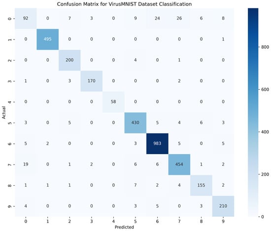 Figure 8 shows the confusion matrix for the VirusMNIST dataset classification, showing generally strong model performance, with clear diagonal dominance that indicates accurate predictions in most families. Class ‘6’ notably achieved high accuracy, as evidenced by the diagonal entry. However, the model struggled somewhat with class ‘0’, misclassifying several instances into classes ‘5’, ‘6’, and ‘7’, highlighting feature ambiguities or insufficient distinction in these cases.