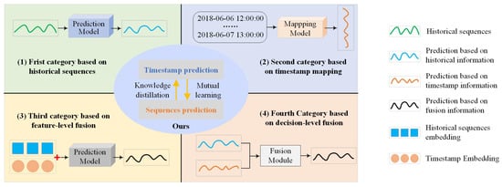 Through a systematic review of state-of-the-art methods, existing works can be categorized into four groups based on how timestamps are utilized. As shown in Figure 1, the first category primarily concentrates on historical sequential observations, completely overlooking timestamps, such as Decomposition-Linear (DLinear) []. A significant portion of the existing works fall into this category. Instead of relying on historical sequences, the second category uses only the multiple temporal features contained in the timestamp, such as the Multi-Feature Spatial–Temporal fusion Network (MFSTN) []. For example, traffic volumes can be approximately estimated based on factors such as weather, holidays, day of the week, and peak hours. The third category, such as Informer [], begins to consider timestamps by summing temporal embeddings with data embeddings. These intricate correlations prompt networks to extract information from more intuitive observations. The fourth category handles the historical sequence and timestamp independently through different models and combines two outputs using fusion weights, such as in the Global–Local Adaptive Fusion Framework (GLAFF) [].