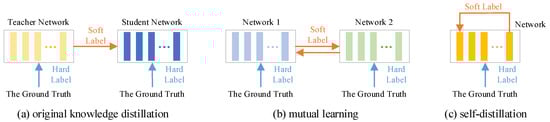 The original concept of knowledge distillation, proposed by Hinton et al., involves transferring knowledge from a complex teacher model with strong learning capacity to a simpler student model, thereby forming a teacher–student network []. The student model, typically lightweight, learns from both the ground truth (as the hard label) and the teacher’s output (as the soft label). By mimicking the behavior of the teacher through soft label supervision, the student model can achieve comparable performance while significantly reducing computational and memory overhead. Due to its superior performance, knowledge distillation has been successfully applied in the field of time-series prediction. For instance, Ma et al. proposed a multi-stage catalytic distillation framework for time-series forecasting which leverages knowledge distillation to facilitate efficient knowledge transfer in edge computing environments []. However, it may be challenging for a simpler student model to absorb all the knowledge from a complex teacher model. To address this issue, researchers have introduced several variations of the original knowledge distillation framework, such as mutual learning and self-distillation, as illustrated in Figure 2.