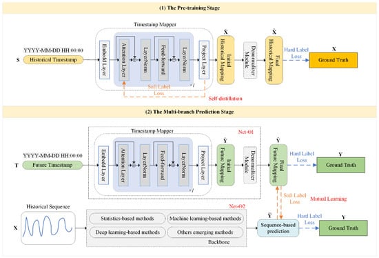 During the pre-training stage, the capacity of the Timestamp Mapper is enhanced through self-distillation, enabling it to learn the relationship between timestamps and observations. Since both historical observations and timestamps are available, the Timestamp Mapper can transform historical timestamps into the final historical mapping , aligning them with corresponding observations . Self-distillation feeds deep feature representations back to the shallow layers, allowing the model to acquire global temporal contextual knowledge more effectively.