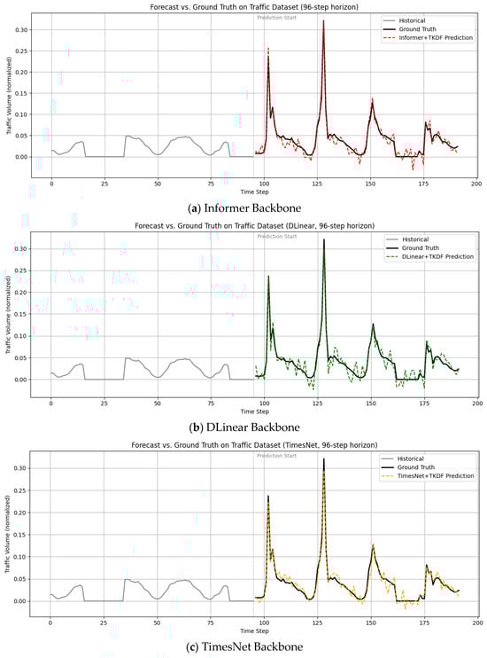 Figure 4a–d illustrate the prediction performance of the four backbone networks of the TKDF. In Figure 4, historical data are marked in gray. The Traffic dataset records traffic volume in hourly granularity. We deliberately selected data with clear periodic patterns and used working-day data (marked in gray) as historical input to predict weekend traffic peaks. The results demonstrate that our method can effectively capture periodicity and provide accurate forecasting. Because the TKDF fully leverages the global information embedded in timestamps, it effectively captures temporal correlations and periodic patterns, enabling accurate prediction of both peak and off-peak values. It can be observed that iTransformer achieves the best prediction performance, demonstrating that the proposed TKDF is also effective when applied to state-of-the-art models.