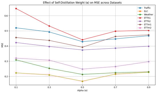 As shown in Figure 5, the self-distillation weight is selected from {0.1, 0.3, 0.5, 0.7, 0.9}. We analyze the influence of different self-distillation weights. When approaches 1, no soft label supervision is involved, meaning that the model relies solely on hard labels. In this case, it cannot benefit from deep semantic representations generated by the model itself and ultimately degenerates into a standard supervised learning paradigm. When approaches 0, the model relies solely on soft labels, resulting in reduced robustness due to potential overfitting to internal representations. Therefore, the results demonstrate that moderate values (e.g., ) yield the best performance, suggesting that both soft and hard labels contribute to improved predictive performance.